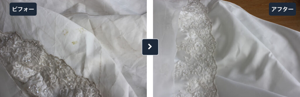 上の画像は花嫁が記念写真で外を歩きまわって出来た汚れですので、かなりのひどい汚れがついていましたがすっかりキレイになりました。他のクリーニング店では「生地が痛むのでこれ以上出来ません」という但し書きがつけられることが多いのですが、当店ではドレスがどのように汚れようとも、可能な限りもともとの純白さを取り戻すよう努めております。