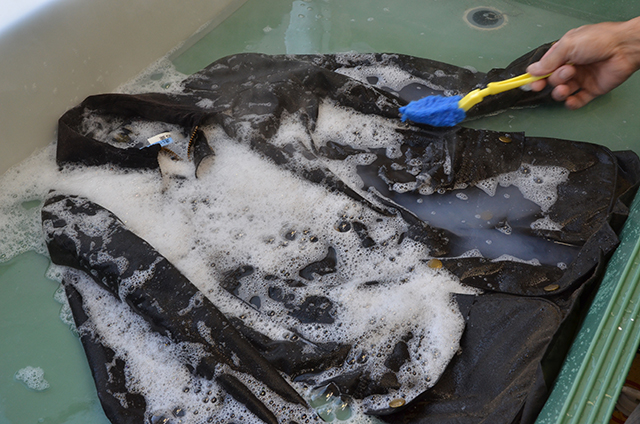 こちらはバブアーのオイルドコートを手洗いしている様子です。