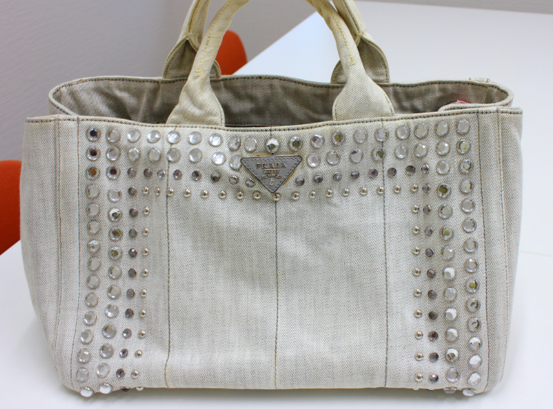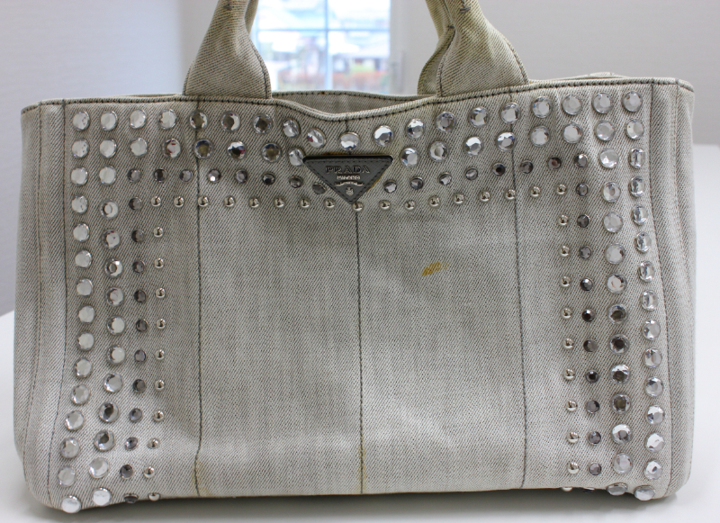 今回ご紹介するのは、ロゴ周辺に茶色っぽい変色が見られたプラダのキャンバスバッグです。