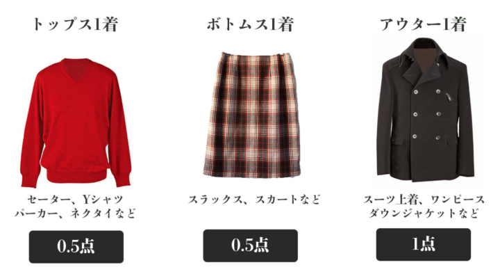 セーター・Yシャツ・パーカー・ネクタイなどは0.5点、スラックスやスカートなどのボトムスも0.5点です。